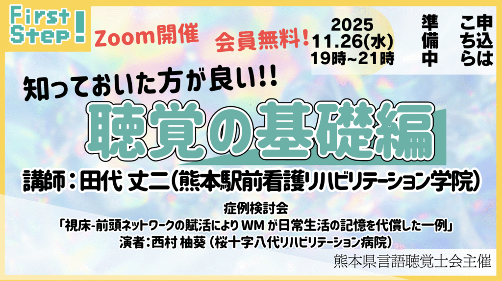 熊本県言語聴覚士会主催の First Step 第8回研修会・症例検討会 を開催いたします。今回は「失語症評価のポイント」をテーマに、学びを深めます。後半は症例... -