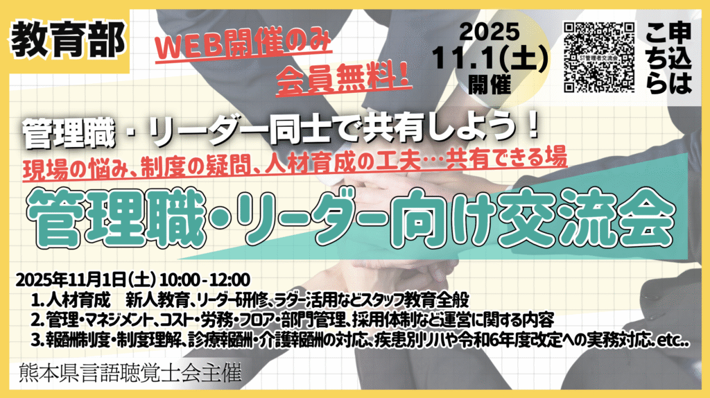 管理職・リーダー同士で共有しよう!現場の悩み、制度の疑問、人材育成の工夫…共有できる場 熊本県言語聴覚士会では、管理職・リーダー層を対象としたオンライン交流会... -